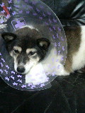 黒白犬 モモ エリザベスカラーをつけている 黒い椅子の上 2010年の写真 100528_202706