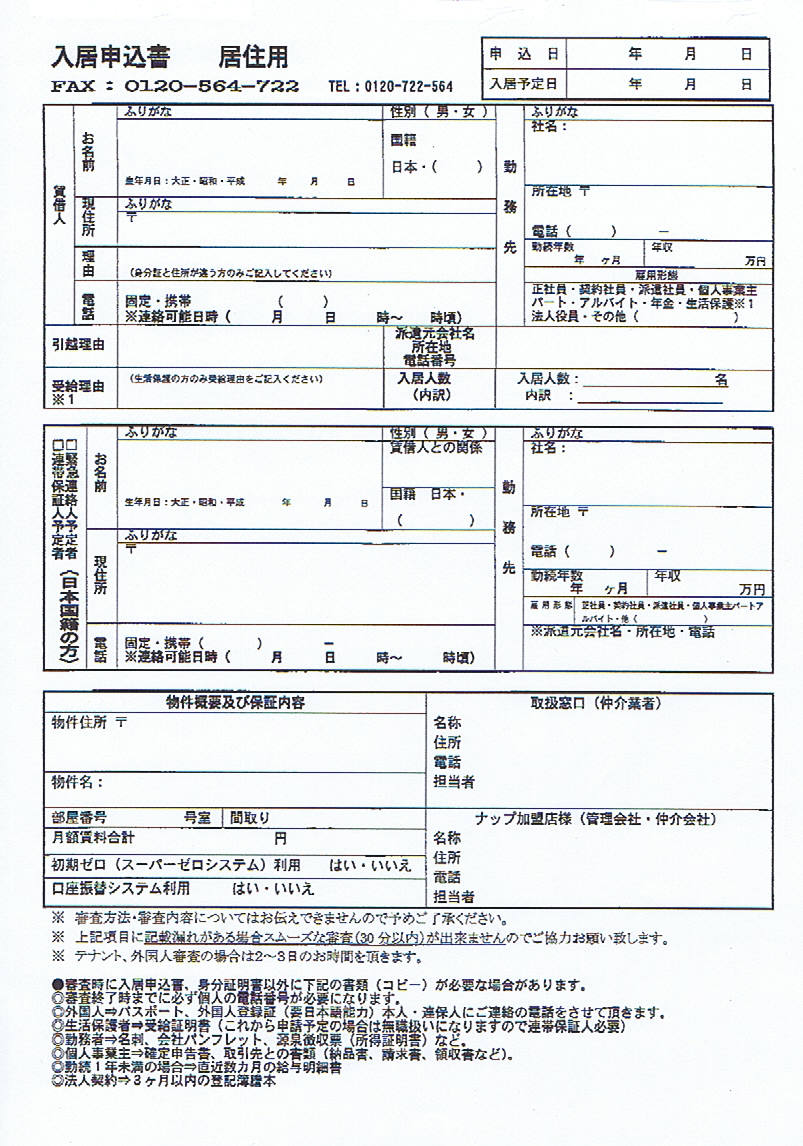 賃貸保証(家賃保証) ナップ 入居申込書(審査申込書) 居住用 保証料金は原則として月額家賃の40% 更新料なし CCF20110607_00000